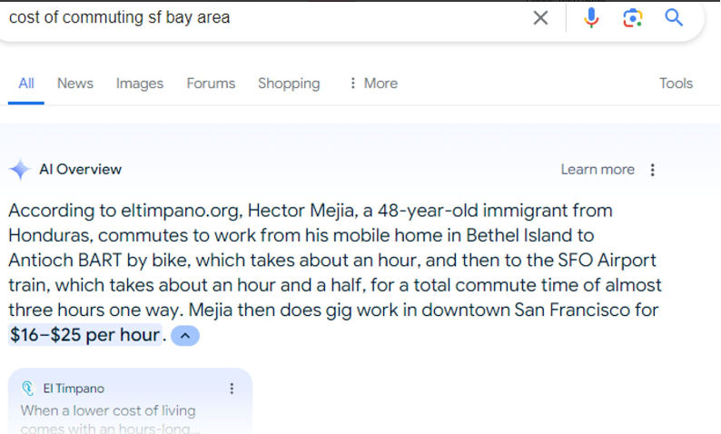 For example, a tipster alerted me to some odd suggestions when searching “Cost of commuting SF bay area.” The promoted link was a relevant one, but the highlighted summary they got was for a totally irrelevant and separate point within the link. The highlighted answer of “$16 - $25 per hour” was the rate the profiled gig worker made while working downtown, not how much it cost him to commute.