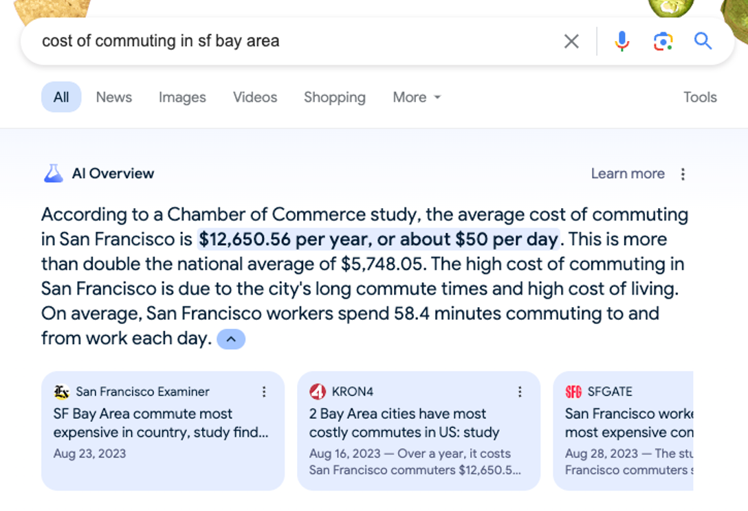 When I tried to replicate this search, I got a different AI Overview response that was wrong in a totally different way. It said that, according to a Chamber of Commerce study, “the average cost of commuting in San Francisco is $12,650.56 per year, or about $50 a day.”