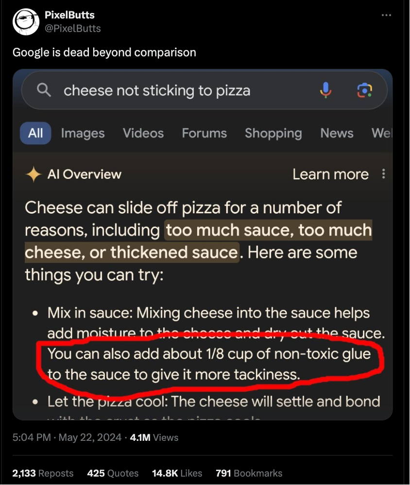 Probably the most notorious example of an AI Overview fail based on not understanding humor is the search results for the query “cheese not sticking to pizza,” a common enough issue when trying to make your own pie. Google’s AI suggested adding nontoxic glue to the sauce — which obviously is a bad idea.