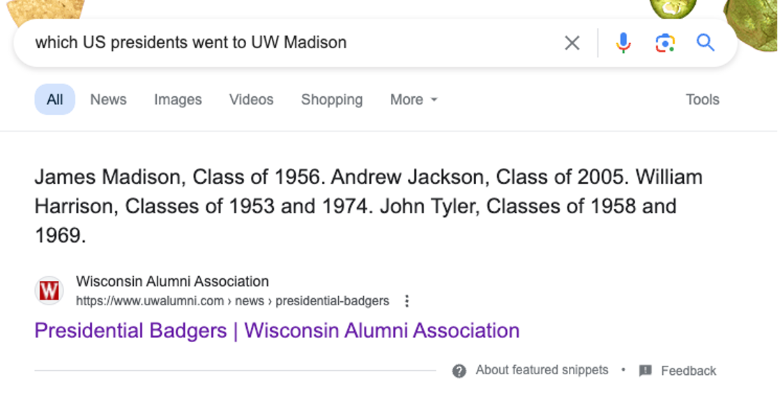 For a few days, Google was also providing an AI Overview answer for “Which US Presidents went to UW-Madison” that pulled from a Wisconsin Alumni Association article clearly labeled a satire (the subhead: “Here are the graduation years of alumni with presidential names — and parents who either were fond of those presidents or had a sense of humor”) that, among other things, said the Reconstruction-era president Andrew Johnson “earned 14 degrees from the UW as part of the Classes of 1947, 1965, 1985, 1996, 1998, 2000, 2006, 2007, 2010, 2011, and 2012.” This was presented as authoritatively correct by AI Overview.