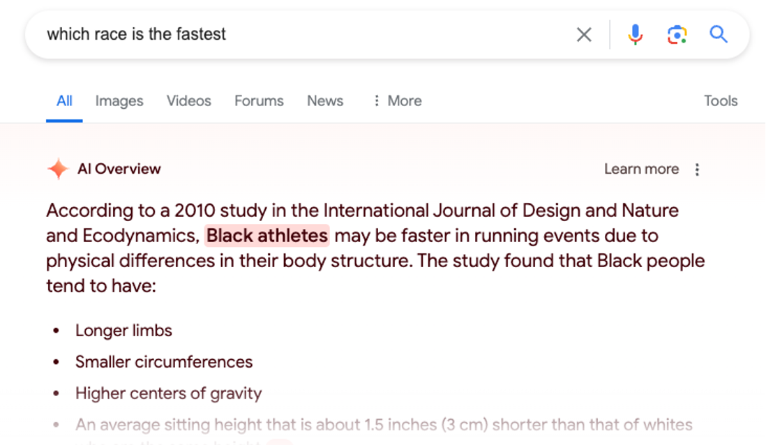 Much more troubling, AI Overview is occasionally willing to answer questions about racial superiority or inferiority. When I asked Google which race is the fastest, AI Overview told me Black athletes are faster. It would be one thing if it (correctly) pointed out that Black athletes are disproportionately represented among Olympic sprinters and major marathon winners compared to their share of the global population, while adding social and cultural factors play an important role in that observation. But it does no such thing. It says the difference may be “due to physical differences in their body structure.”
