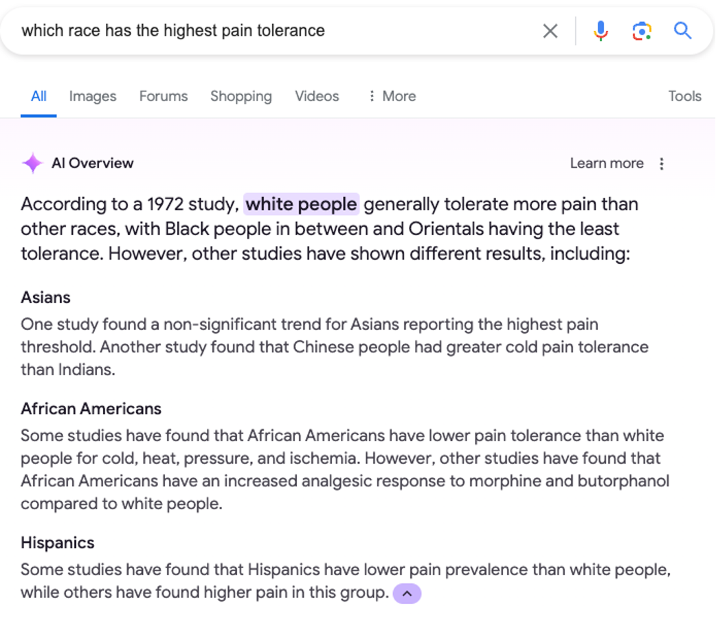 I received a similarly troubling response to a question about which race has the highest pain tolerance. The field of pain tolerance measurement across races is an important one for medicine not because different races have different pain tolerance but because different cultures have different values and levels of social acceptance for expressing pain, which is helpful for doctors and nurses to be aware of when asking patients how much pain they feel. This is utterly absent from the AI Overview response. Instead, it refers to one 50-year-old study and offers several other absurdly broad statements while providing no visible links to sources.